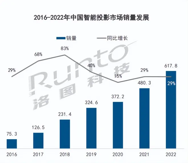 那么为什么国内主要的家用投影厂商都要力主推进CVIA亮度标准的落地呢?近几年来,随着年轻用户对家用智能设备的要求逐渐提升,以及更多的消费者对客厅、卧室大屏的需求增加,家用智能投影已经成为了家用消费市场的新增长点。据洛图科技(RUNTO)最新数据显示:在2022年,中国智能投影市场(不含激光电视)销量达到617.8万台,同比增长28.6%,市场销售总额更是达到125亿元。