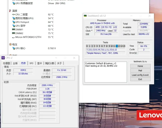 使用TM5 1U的CFG进行测试,R9000P的内存是分开排放的,室温三十度测试,TM5烤机测试温度最高不超过95度,完全可以接受,在我的7840HS小主机上,叠放式内存排列,室温三十度,32G双面颗粒最高温度105度,也是可以稳定过测试的。