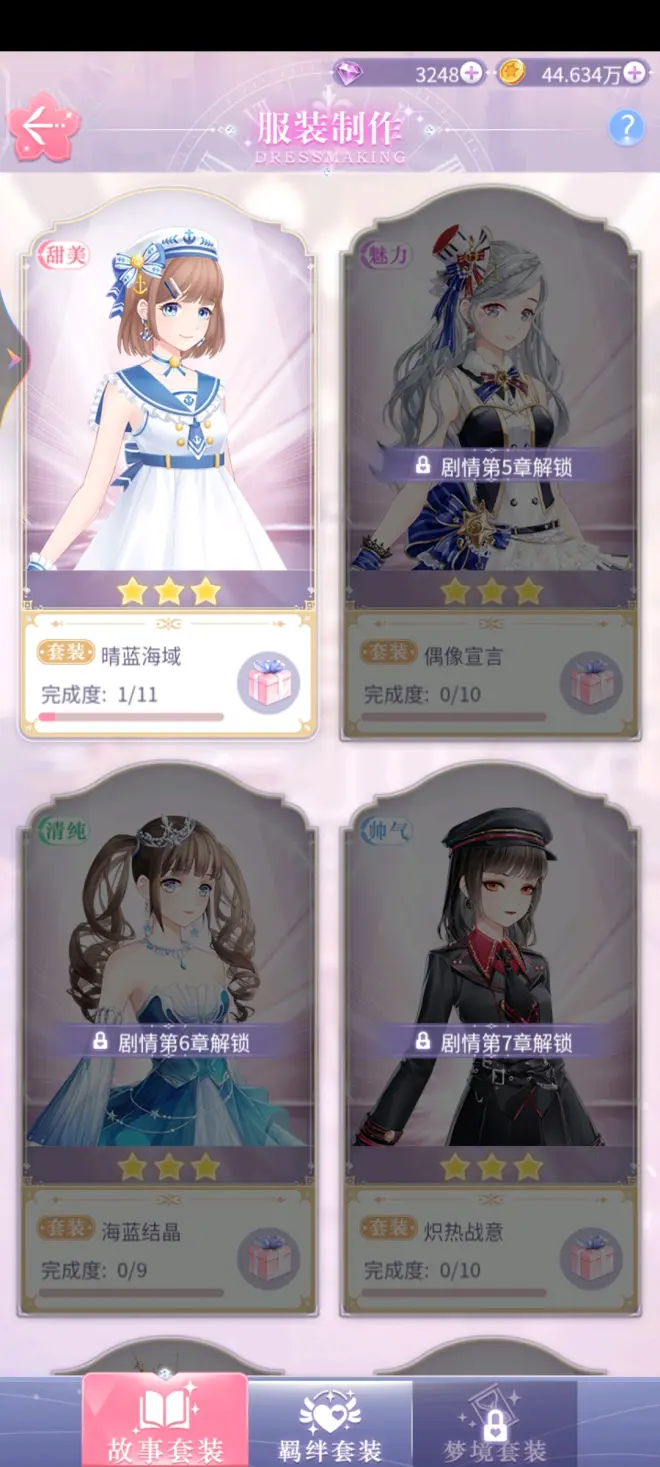 分【服装】、【卡牌】和【总体提升】三个板块展开。 【服装】 【家】-【服装工坊】-【服装店】