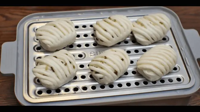 花卷是预制的,蒸得非常蓬松,比较的软,掰开看整个花卷也已经Q弹,蒸花卷实际只要4分钟,那些容易熟的我建议放在上一层,毕竟上层的温度稍微没有下层的高,但是上层的温度也接近90℃,记得别烫伤。