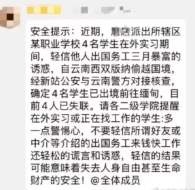 今年3月,安徽4名大学生在外实习期间,因轻信陌生网友“出国务工三月暴富”的诱惑,从西双版纳偷越国境出国务工,结果在缅甸失联,好在数日后被警方安全找回。