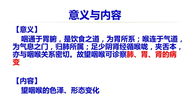 望咽喉,主要诊察肺胃和肾的病变。一般来讲,实证在肺和胃,虚证在肾。