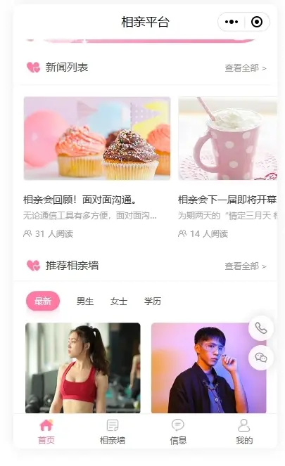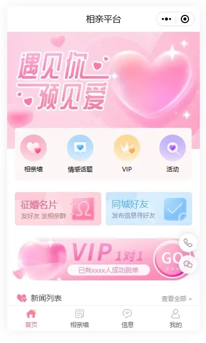 根据相亲交友网站的需求,我们可以在小程序首页设置相亲墙、情感话题、vip、活动、征婚名片、同城好友等关键功能,丰富多样的功能更能吸引大家去注册和使用,同时我们可以在小程序下拉页面中展示新闻列表、相亲墙,并根据类别进行精准分类,助力大家寻得良缘,早日脱单
