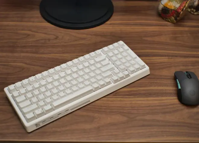 作为一款主打实用的三模机械键盘,初看RKG98机械键盘第一眼,就有回到十年前键盘的感觉,纯白色键盘主体及键帽,很有早期键盘质感,那是第一代网民对计算机键盘的初始印象。