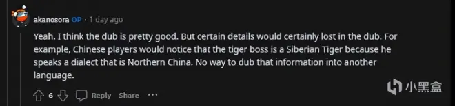 是的,我认为配音相当不错!但某些细节肯定会在配音中丢失;例如,中国玩家会注意到老虎老板是东北虎,因为他说的是中国北方的方言,没有办法把这些信息翻译成另一种语言。
