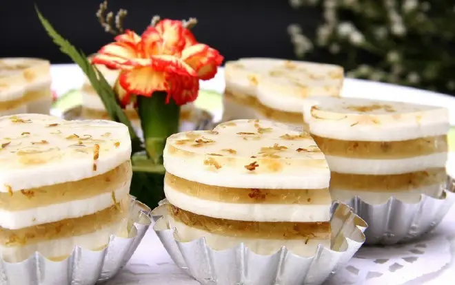 佛山桂花糕是佛山的传统糕点之一,也是佛山五大美食之一。它的主要原料是糯米粉、桂花、白糖等,经过蒸制而成,口感软糯、香甜可口。佛山桂花糕以其独特的香味和口感而受到广大食客的喜爱。