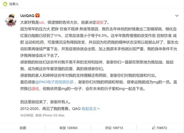 Uzi正式退役!去年就已患上糖尿病,功成身退,永远滴神