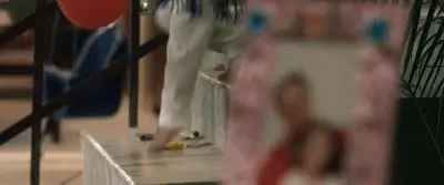 皮胡为了捡娃娃,爬上了护栏准备一跃而下,幸好对楼的阿姨吓止皮胡,皮胡才爬了回去。