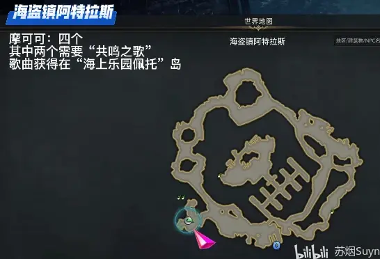 有四个摩可可,左下的两颗需要进入隐藏空间,在雕像面前演奏歌曲“共鸣之歌”即可进入。