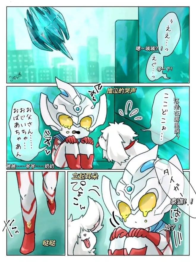 泰迦小时候经常迷路,害怕的嚎啕大哭,爸爸经常着急的脸色大变,直接飞出门找孩子,每次都是好心人送孩子回家(被日本网友调侃方向音痴 ) ↓推特上的吐槽,画师的创作