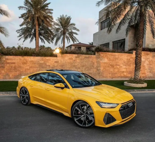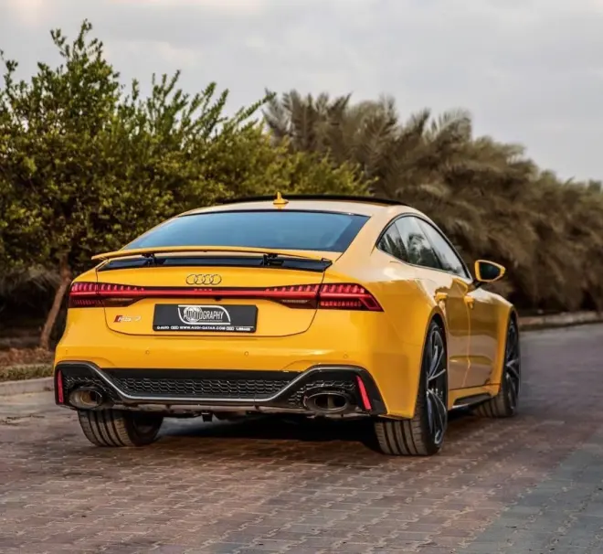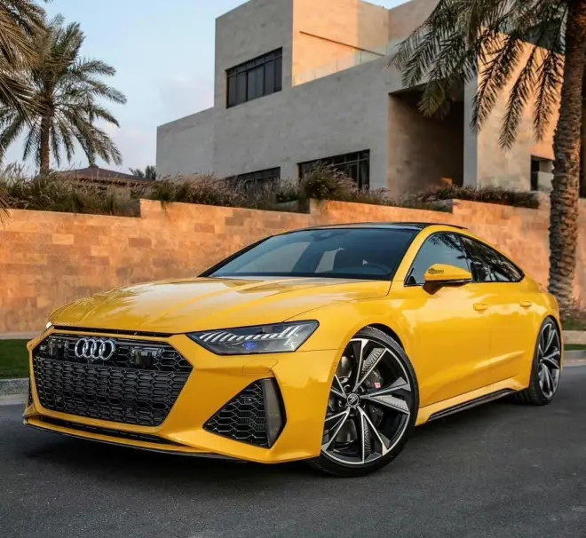 奥迪RS7 Sportback (维加斯黄) 奥迪A7可参考改装: 1.RS7前包围件套 2.RS7侧裙 3.RS7后包围件套 4.鱼鳞轮毂 5.刹车卡钳定制 6.外观镀铬条黑光包黑化 7.激光大灯 8.动态尾灯 9.车身颜色