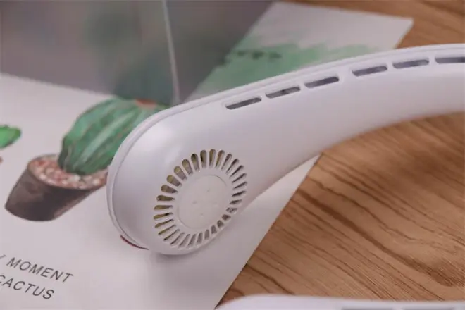 挂脖风扇出风口位于机身的前端左右内侧和顶部两侧,可以看见这些位置都设计了大面积的开孔,便于出风顺畅。
