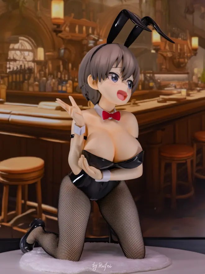 我觉得Freeing虽然有无数值得吐槽的地方,但是至少大部分1/4兔女郎版做出来脸都没太崩。这款宇崎花也是忠实的还原了人设,头发的阴影打的很漂亮所以立体感很强,甚至比隔壁小比例做的都好,标志性的肉虎牙也完美还原!面部更是把“明明很害羞但是还要秀一把”的神情准确还原了。问题当然也有,就是因为过于还原原设,整个手办都变的不稳定了,当然你知道我指的是什么!