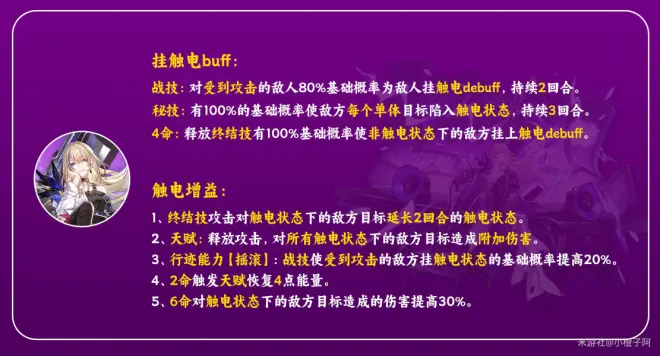③ 上述提到额外能力【摇滚】能使战技的挂触电debuff的基础概率增至100%。