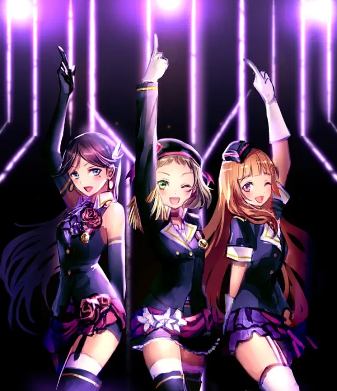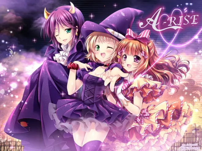 LoveLive企划中首个对手团是三人偶像团体A-RISE,在LL动画中与μ's互为竞争对手。领队绮罗翼是戴着帽子的短发少女,身材娇小,但舞蹈动作利落且富有有冲击力,因此担任C位;统堂英玲奈性格成熟,戴着发箍留有一头暗酒红色长发;优木杏树走的是大小姐风格,有着一头飘逸蓬松的橙发、配戴花型发饰。