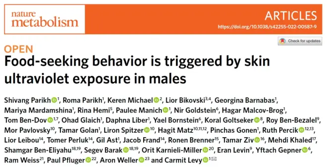 2022年7月,以色列特拉维夫大学的研究人员在 Nature 子刊 Nature Metabolism 上发表了题为:Food-seeking behavior is triggered by skin ultraviolet exposure in males 的研究论文。