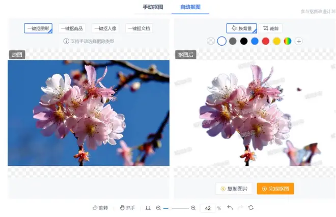 3、上传图片后等待片刻后抠图就抠好了,然后右边的功能分区内选择换背景中的白色背景,然后照片就处理完成了。下面展示一下处理后的图片效果~