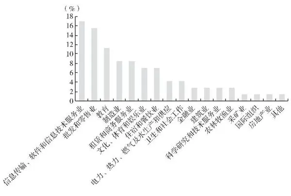 在我国政府“大众创业、万众创新”的战略部署下,越来越多的“海归”创业者加入创业大军。“海归”创业者不仅来自美国“硅谷”,也有来自北欧、德国、法国、英国、韩国等国家和地区,他们带来环保、医疗器械、生命科学、时尚设计、工业设计、“工业 4. 0”等不同领域的技术和经验,为我国新兴产业创新带来了新一轮“春风”。调研显示,信息传输、软件和信息技术服务业、批发和零售业、教育行业成为“海归”创业行业的优先选项,如图 8—3 所示。