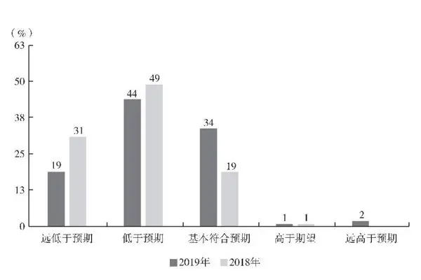 随着自费留学人数急速攀升,留学大众化已成事实。“大进大出”的人才流动带回大量留学人员,年轻的“海归”们充实了国内的就业大军。从2000年仅9100名归国留学生,到2019年58万人的“海归”大军,“海归”人才的就业竞争已渐入白热化。头顶“海归”光环,仅凭一张海外镀金证书就能得到企业青睐的时代已渐行渐远,新时代留学回国人员的求职路并没有想象中那般顺畅。求职时间错过“校招”季、不熟悉国内就业市场需求、国内人脉关系较弱、不适应国内人情社会、难以获得发展机会、“海投”效率低下、不熟悉国内市场环境等问题都成为“海归”人才求职受阻的原因。基于出国留学的高昂费用,“海归”们往往对薪酬的期望值较高,导致期望薪酬和实际薪酬存在较大的落差。根据CCG调查发现,约 63% 的“海归”人才认为薪资水平“低于预期”(44%)以及“远低于预期”(19%)。不过,这个比率较 2018 年已有所下降。这一方面说明,“海归”人才在对国内就业市场的认识增加后,对薪资期待有所降低;另一方面也说明一些企业适当提升了“海归”人才待遇,如图8—1 所示。
