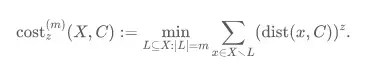 在该鲁棒聚类目标函数中,首先把数据点按照到 C 的距离进行排序,然后剔除掉最远的 m 个点,最后在剩下点上套用经典聚类的目标函数。特别地,当 m=0 时,该问题退化成经典的聚类问题。目标函数中的 z 是距离求和的幂次,常见选取 z=1或2,分别对应于 k-median 和 k -means 的目标函数。