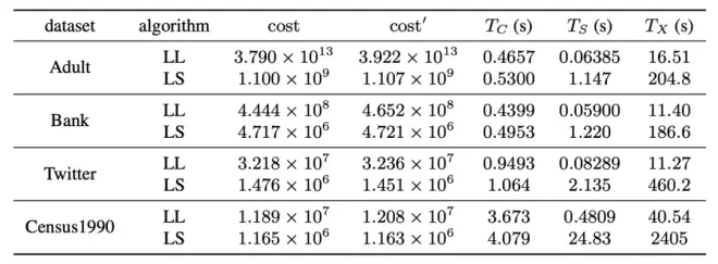 另外,我们进一步从实验上证明了我们的核心集可以显著加速已有鲁棒聚类算法。我们选择测试了两种算法:基于经典 Lloyd 的算法(LL)和局部搜索算法(LS)。实验表明,在大小约为1000的核心集上运行算法(记运行时间为 )与在原数据集上运行算法(记运行时间为