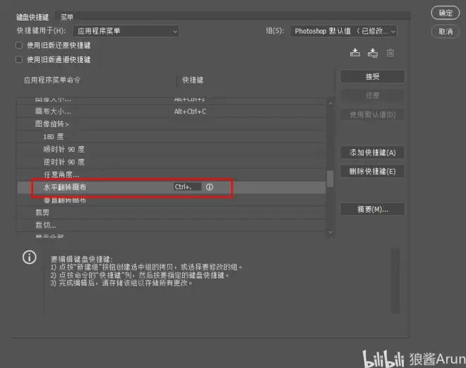 然后我们在设置面板上把“快捷键用于...”选项调到“应用程序菜单”,然后点击下面的“图像”,把它的子项目展开,拖动右边的滚动条往下走,找到“水平翻转画布”