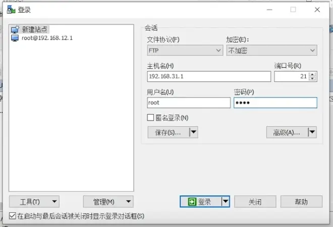 12.打开WinSCP软件,连接路由器,文件协议FTP,主机名192.168.1.1,用户名及密码为root,点击登录。