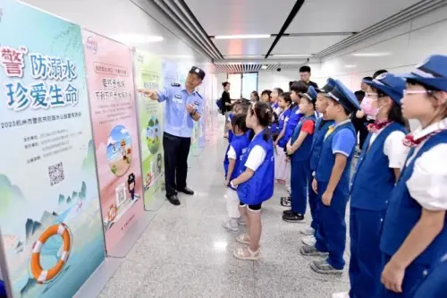 近日,钱江水上派出所的民警在地铁定安路站和西湖文化广场站,对参加活动的中小学生进行“防溺水”宣讲,讲述水中游玩时易发生溺水情形以及如何避免溺水、通过现场宣传预防中小学生溺水“十要十不要”等安全知识。并在现场展示救生圈的使用方法、应急救援等环节。