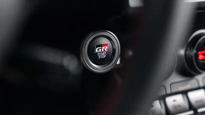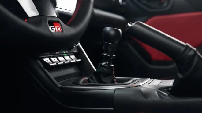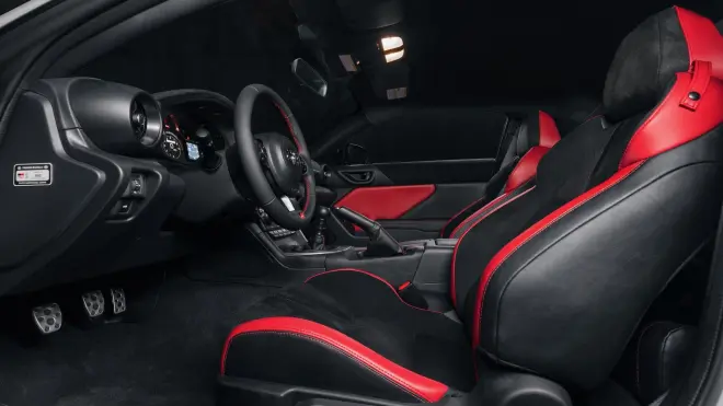 座舱方面,Trueno Edition采用黑红双搭配色方案,座椅采用麂皮翻毛面料,两侧为真皮材质,主体为黑,边缘为红。方向盘采用红色缝线,底部配有“GR”车标,同时集成了车辆启动按键。