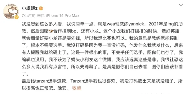 而就在今天凌晨,知名陪玩店老板,ID名叫小虞姬的人再次爆出LPL存在假赛,内容直指现任WEA教练、前LNG助教,从其曝光的具体详情来看,是因为这个助教曾试图操纵比赛里的BP以及小龙资源,并且导致当事人亏损65万,一直没还钱不说,如今还将他拉黑,最终选择曝光。