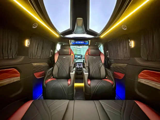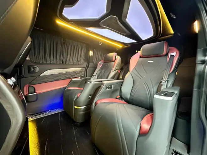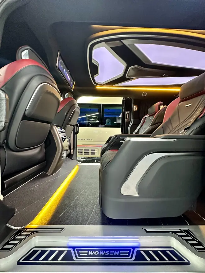 二三排座椅经过了全面换装之后,舒适度极高,二排座椅更是拥有座椅通风、座椅加热、座椅按摩等功能,疲惫 的时候还可以将腿托升起来,给予最舒适的支撑。如果将第二排座椅向后旋转180°之后,还能同第三排座椅形成一个独立的会客区。无论是休闲娱乐还是移动办公都是非常不错的一个独立空间!