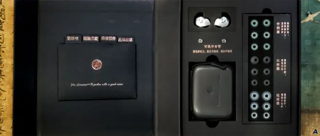 右面:左上角是耳机本体;中间是一对可换导音管,增加了可玩性,在这个价位很少看到;右下角是皮质收纳包;右面则是三种耳机套,各有S/L/M三副,其中“竹韵套”是品牌独有,泛出淡淡的青绿色,有点意思。