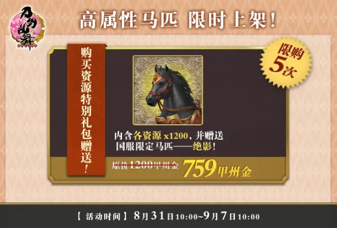 前往「万屋-特卖」购买「绝影资源礼包」,即可获得各资源*1200,并额外获赠中文版限定高属性马匹「绝影」。「绝影资源礼包」原价1200甲州金,限时特惠759甲州金,活动期间最多可购买5次。