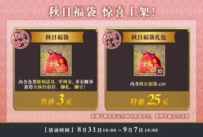 活动期间在“万屋-特卖”购买秋日3元现金福袋,必得甲州金及各类便利道具或资源。审神者必定开出一定数额甲州金,以及经验符、全体经验符、御札、御守等超值商品,所有内含商品价值均高于福袋售价,夏秋日福袋每日限购10个。