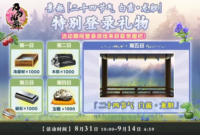 ※若审神者已经拥有景趣「二十四节气 白露·龙胆」,第5日累计登录奖励将替换为:小判箱·大*3、加速符·极*2、委托符*2。