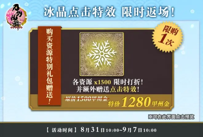 ※已拥有点击特效「冰晶」的审神者无法在「万屋-特卖」界面查看、购买该礼包。