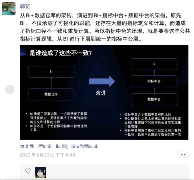 昨天郭忆大佬朋友圈分享,跟语兴描述很像,他在数据中台到数分侧又多加了一层,如下图