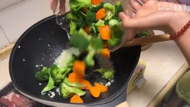 3️⃣蒜蓉爆香,放入西兰花,胡萝卜,木耳,牛肉丸,干贝,放生抽耗油.
