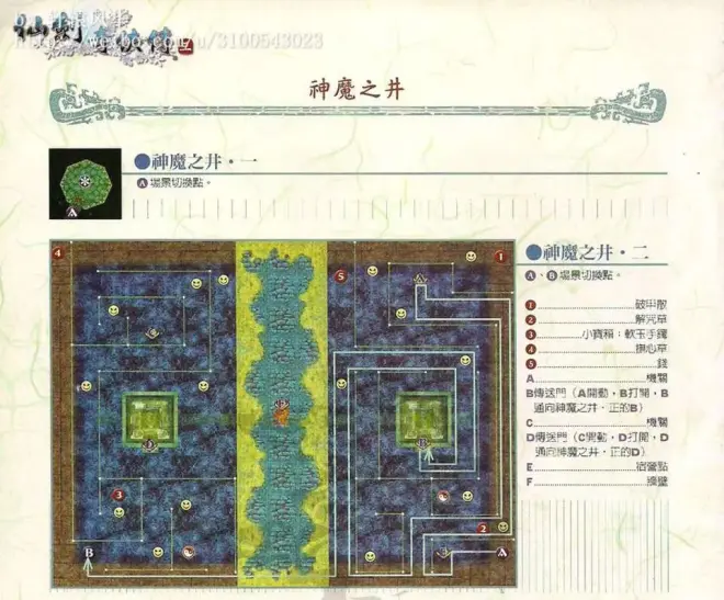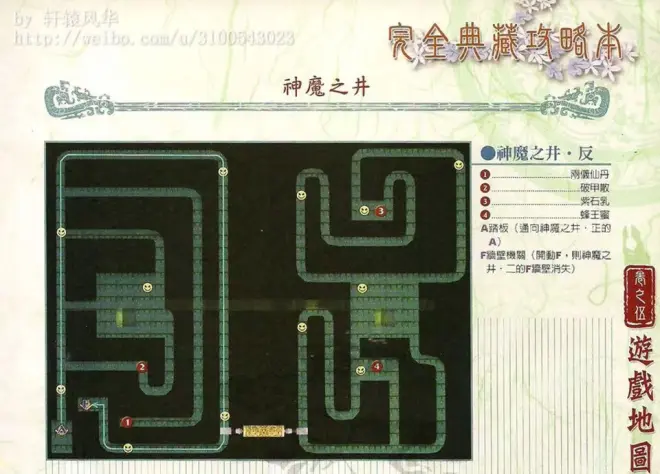 剧情结束后正式进入神魔之井,整个一楼是由两部分组成分别为东(神魔之井一)西(神魔之井二)。在刚进入神魔之井后从西(神魔之井二)开始,此时东西两部分会被一道墙所隔开,正常拾取①②⑤后打开机关A,会将B处紧闭的石门打开,从B处来到神魔之井正。