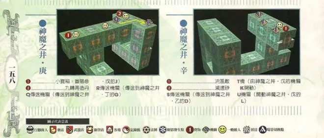 来到神魔之井反,图中①②③④物品皆可拾取,可以通过跳跃的方式从左侧进入右侧依次拾取。开启机关F会将最初隔离的神魔直径一二东西两部分的墙降下去。原路返回到神魔之井一二。来到神魔之井一。此处需注意在地图左下角(即B出口)会直接前往神魔之井戊,先不要进去,开启机关C后再从D升降梯来到神魔之井正,开启大宝箱②后,再进入传送阵B。