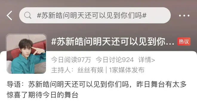 前天苏新皓发布了一组图片动态,图片中的他穿着湖蓝色衬衫比耶随拍是帅气的,文案中有问到“明天(7月23日)还可以见到你们吗”,这句话好让人期待他的新舞台。虽然今天的演唱会已经结束了,但还是期待官方能把演唱会内容分享出来。