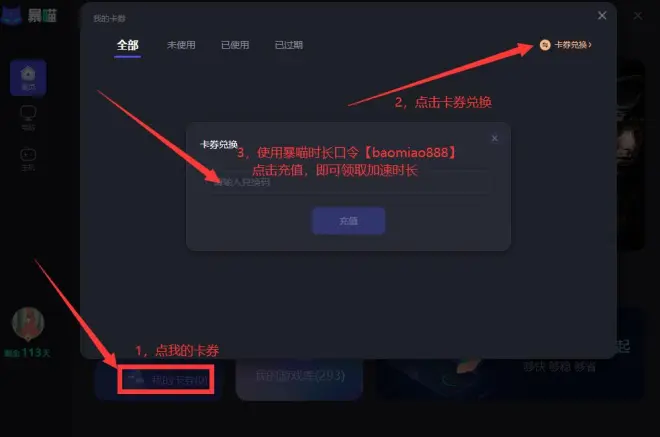 使用“baomaio888”这个兑换码还可以增加一些时长,如图示操作
