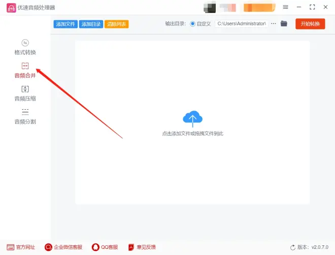 步骤2、只需将要合并的两段音频文件上传到网站中,选择合并方式(顺序或混音),然后点击开始合并即可。