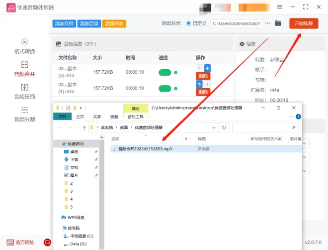步骤4、上述三步操作完成后,点击【开始转换】按钮,这样软件就将我们上传的两个录音文件进行合并了,当系统自动弹出打开输出文件夹时,合并结束,在这里保存着合并后的录音文件。