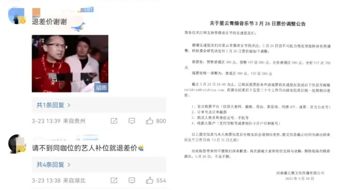 比如,婺女洲星云青燥音乐节3月26日“青春场”演出,原定阵容张靓颖因身体不适无法参与,大量乐迷转而选择退票,剩余阵容几乎均为INTO1刘宇、张颜齐、赵让、卜凡等新晋流量偶像。购票乐迷小张就表示,在3月23日张靓颖取消参与的消息传出后,不少消费者在音乐节官方账号下要求退票,“因为咖位不同定价也不同,既然找不到同一层次的补位演出,就应该退票退差价,因此很多人都是临时退票”。