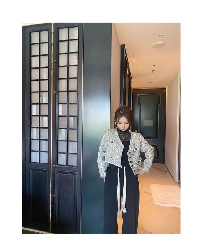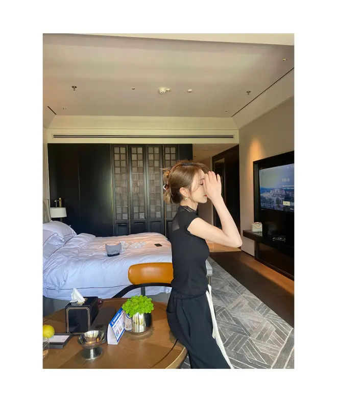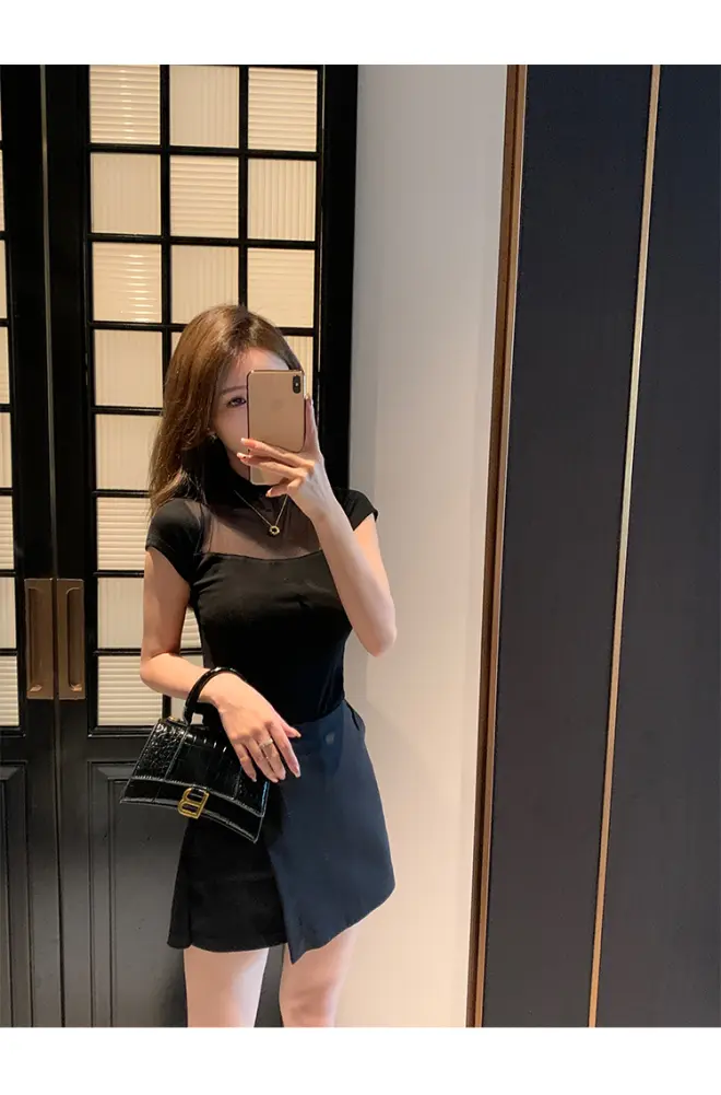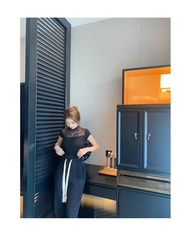 » Juicecola 初秋新款黑色网纱拼接长袖t恤女修身气质名媛打底上衣