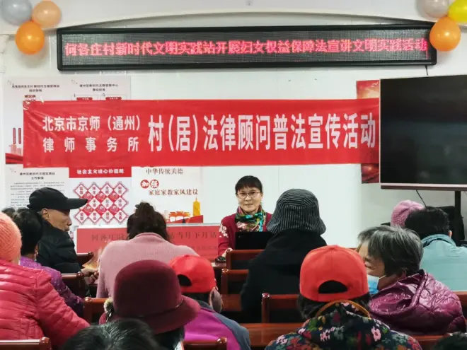 为认真贯彻落实“村(居)法律顾问”的具体工作,充分发挥律师在乡村振兴法治建设中的重要作用,2023年3月8日,北京市京师(通州)律师事务所管委会主任冯沛霖律师团队深入到通州区西集镇,为望君疃村、冯各庄村和何各庄村村民开展三八妇女节法律讲座,并为南小庄村村民提供了法律咨询,对妇女权益保障法相关内容进行了现场讲解并与村民进行互动交流。
