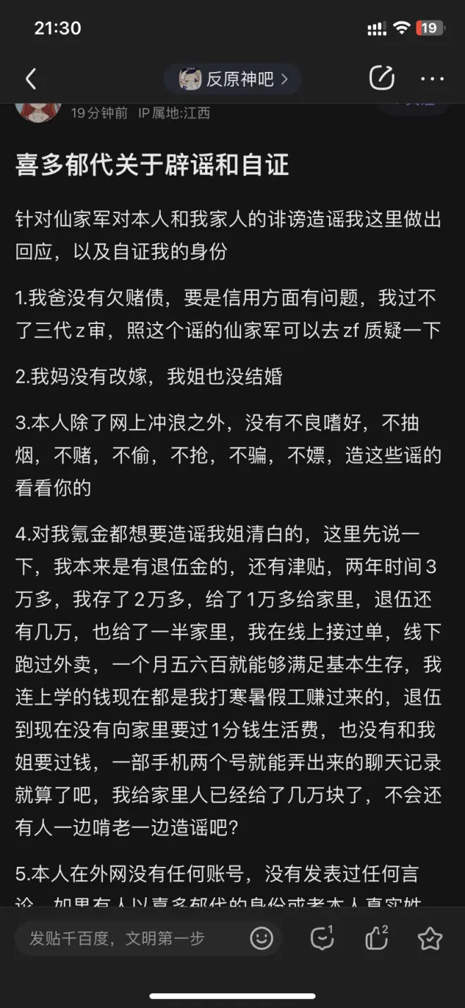 4.6.兵王自称是在校学生,回来就去上学,又说暑期打工赚学费。然而兵王一天24h高强度举办扣冒烟的情形来看,显然不属实。这也与其姐姐所说“当兵回来什么都不会,沉迷二次元天天蹲在电脑前面”不符。 5.胡没有玉玉症,但是有玉玉倾向,该结论出自其姐微博,消息来源是兵王当兵时部队内与其母亲的联系。
