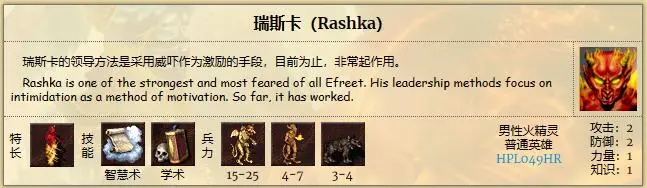 唯一的酱油并且技能奇葩的,也就是火怪 瑞斯卡(Rashka)了,说你自带学术不带魔法书也就罢了,你自带智慧术,也不带魔法书,全游戏你真的就是最靓的崽了!估计火怪的智慧都放在脑子里,但这个奇葩的英雄常常让萌新玩家一眼就看成一个法系英雄,但这货还是个战士,还特长火精灵,虽说火精灵是地狱一哥,但这个兵种特长也基本上等同于没有,话说地狱英雄人才辈出,而这个火怪绝对算是其中翘楚了。