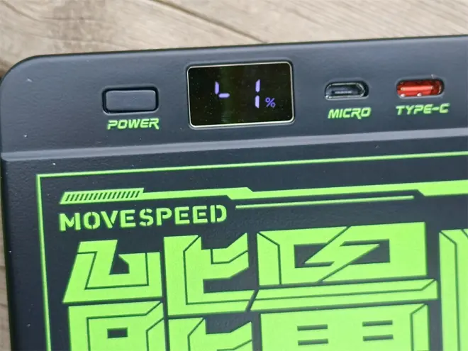 所有的功能键和充电槽位均集中排布在电源上方。从左到右依次是电源键、电量数显屏、MicroUSB接口、Type-C接口、支持普通充电的A1、A2和支持快充的A3(支持22.5W快充)共3个USB-A槽位,槽口类型丰富,满足多个设备同时充电的需求。